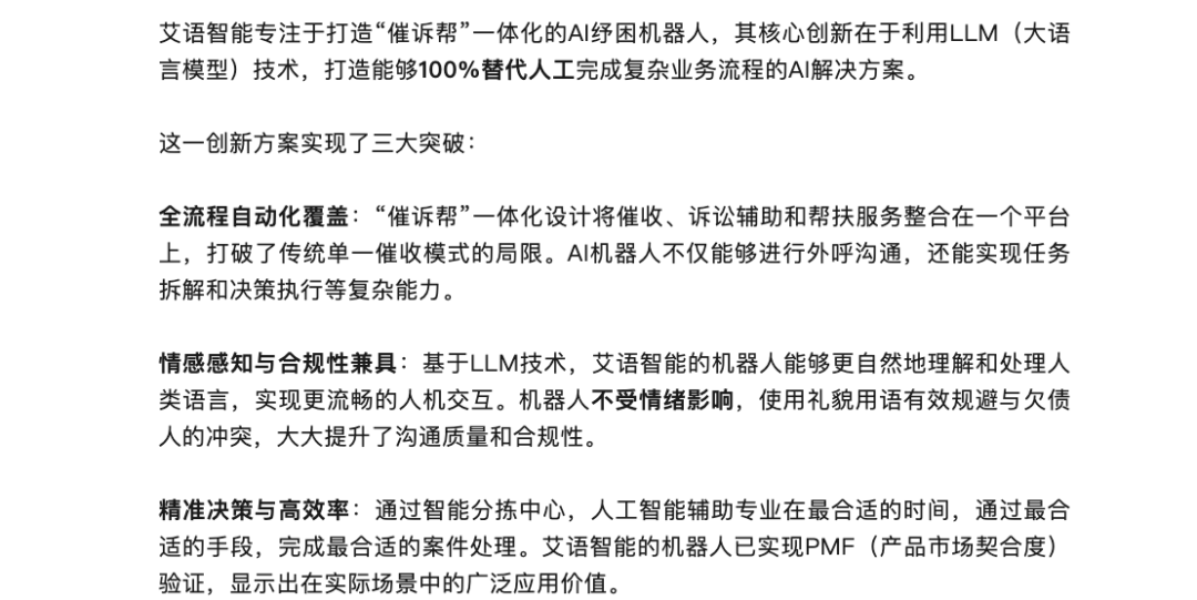 据引见,该产物有三大冲破:“催诉帮”一体化,“将催收、诉讼辅帮和帮扶办事整合正在一个平台上”;基于大模子手艺,正在进行外呼时可以或许更天然地舆解和处置人类言语,“感情取合规性兼具”;机械人可以或许正在最合适的时间,通过最合适的手段,完成最合适的案件处置。自2023年以ChatGPT为代表的大模子横空出生避世后,一曲正在持续演进,用AI语音取代身工进行电催曾经越来越遍及,而通过大模子手艺实现电催成果的智能标注,并正在智能标注的根本长进行深度阐发,进而引入个性化的沟通策略及还款方案,也同样有不少金融机构、催收办事商正在摸索。到了本年1月份,正在混沌学园的一期专访中,艾语智能似乎放弃了大而全的催收机械人叙事,转而出力凸显“AI批量立案”功能,将本人的特色归纳为“面向银行、消金的批量立案调整办事,笼盖要素抽取、材料生成、目次、流程推进、质检复核取人机协做”,并暗示方针是把批量诉讼从“人驱动流程”升级为“模子驱动交付”。