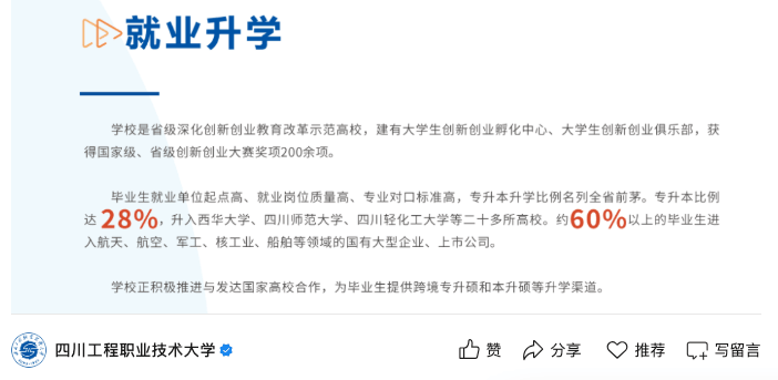 四川工程职业手艺大学位于四川省德阳市,学校始建于1958年,时名德阳沉型机械制制学校,1962年,学校改名为第一机械工业部德阳机械制制学校,具有耀眼的部下布景,后又历经多个成长阶段,正在2024年更为现名,也是四川省第一所公办职业手艺大学。而正在我国,但凡是具有部下布景的高校,无论后面成长若何,大大都环境下,结业生就业质量都不会差。
